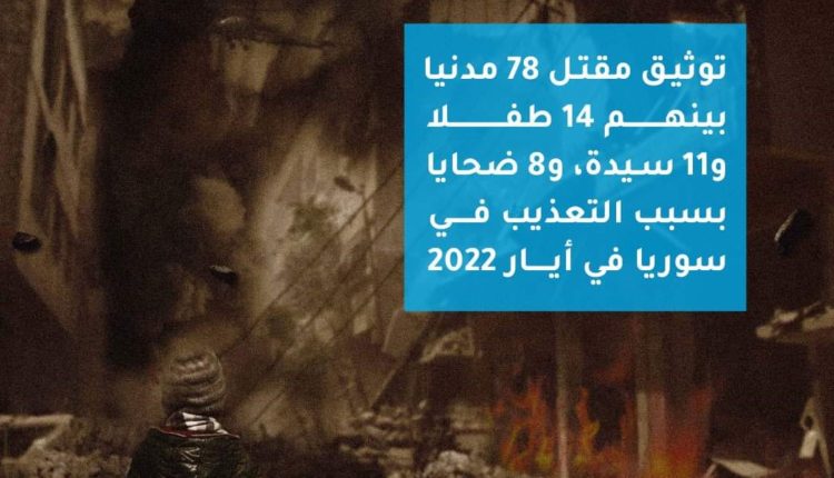 وثق التقرير في أيار مقتل ثمانية أشخاص بسبب التعذيب بينهم سيدة واحدة، جميعهم قتلوا على يد قوات النظام السوري، وبذلك أصبحت حصيلة الضحايا بسبب التعذيب 95 شخصاً منذ مطلع 2022 حتى حزيران من العام ذاته.