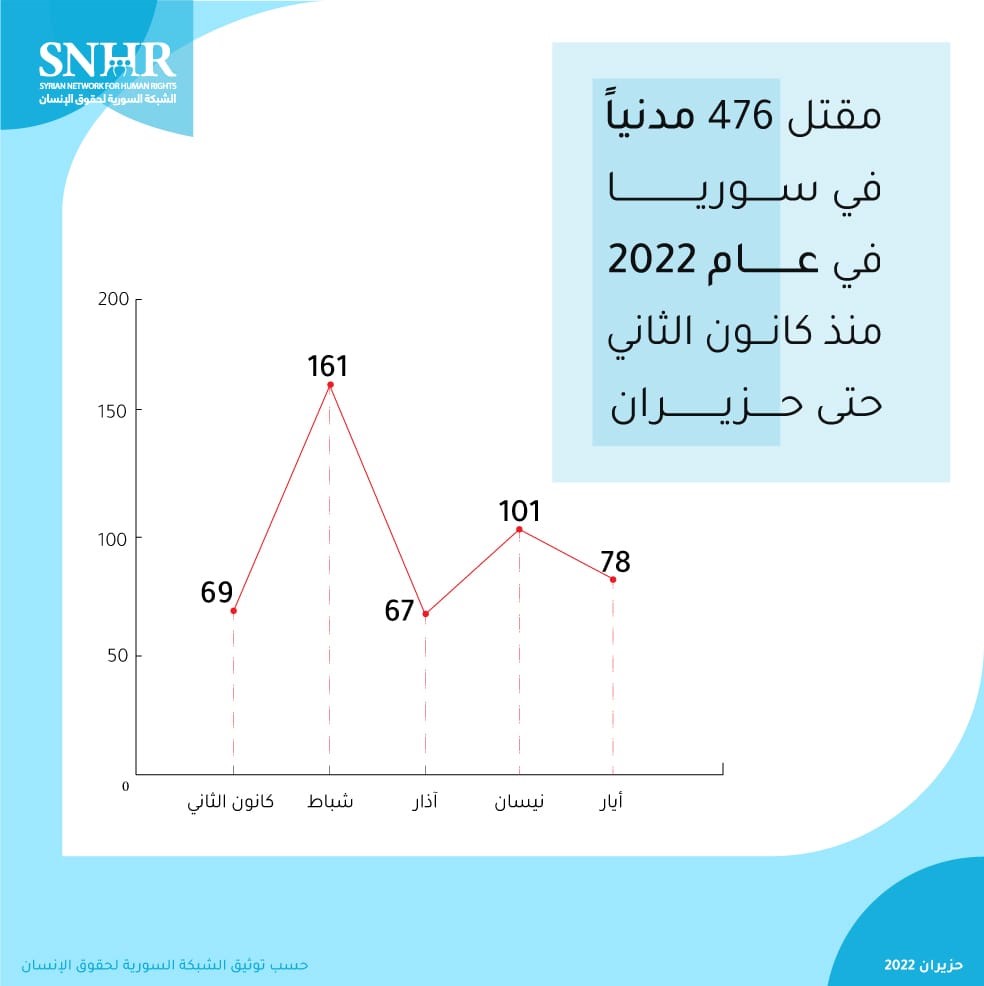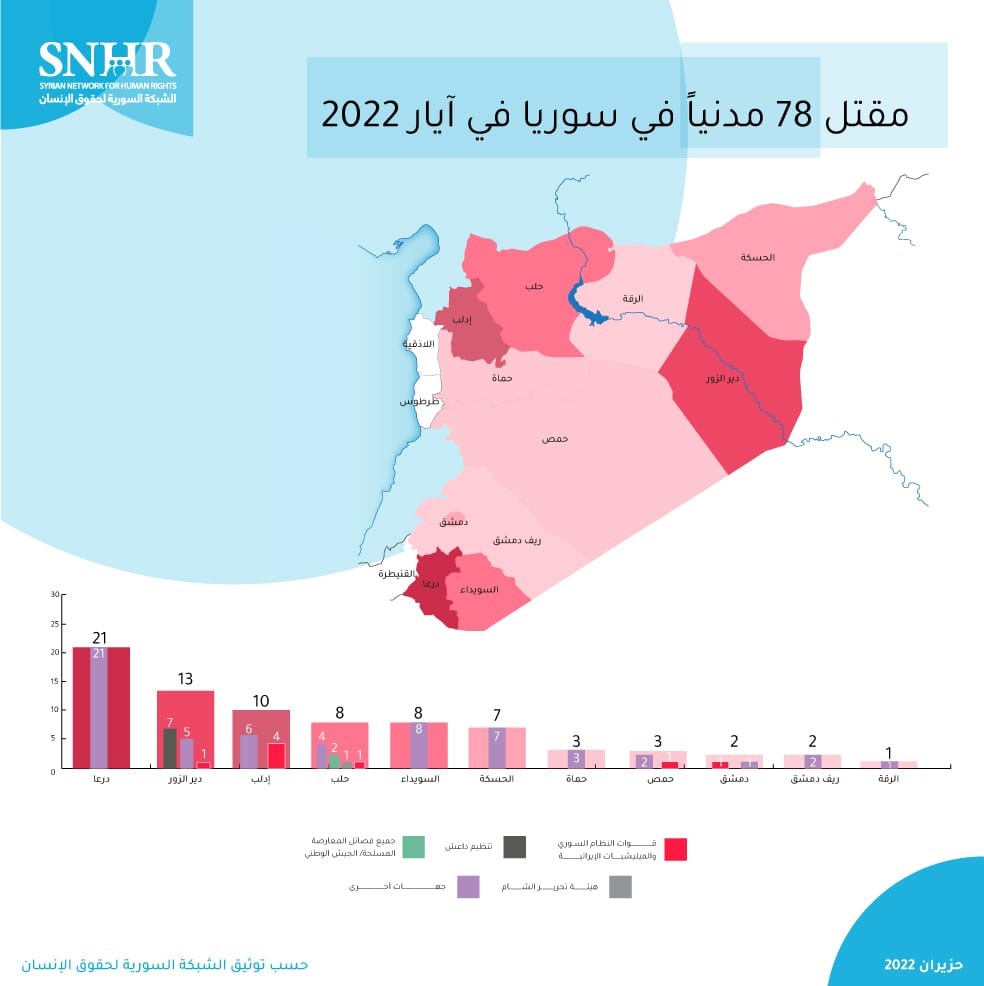 رصد تقرير “الشبكة السورية لحقوق الإنسان” الصادر يوم الأربعاء 1 حزيران 2022، مقتل 78 مدنياً، بينهم 14 طفلاً و11 سيدة في سوريا في أيار 2022، على يد جميع أطراف النزاع والقوى المسيطرة في سوريا، وبذلك أصبحت حصيلة الضحايا المدنيين 476 مدنياً منذ مطلع عام 2022 حتى حزيران من العام ذاته.