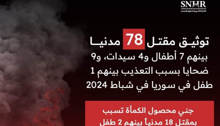 الشبكة السورية توثق مقتل 78 مدنيا بينهم سبعة أطفال وأربع سيدات في سوريا في شباط 2024