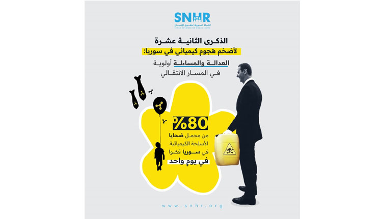 وثّقت الشبكة السورية لحقوق الإنسان أن قوات نظام الأسد أطلقت ما لا يقل عن عشرة صواريخ محملة بغاز السارين، تُقدَّر كميتها الإجمالية بـ 200 لتر، في أربع هجمات متزامنة على الغوطتين. استُغلت الظروف الجوية التي أبقت الغاز ملاصقاً للأرض، ليحصد أكبر عدد من الأرواح وهم نيام. الحصار المفروض منذ 2012 منع وصول العلاج والدواء، فحوّل الكارثة إلى إبادة جماعية بطيئة.