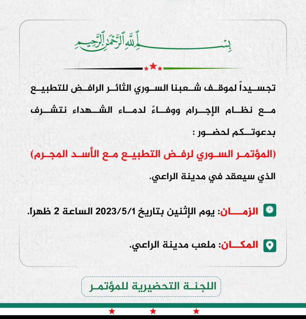 “المؤتمر السوري لرفض التطبيع مع الأسد المجرم” والذي سيعقد في مدينة الراعي يوم غدٍ الإثنين بتاريخ 1/5/2023 في الملعب البلدي”