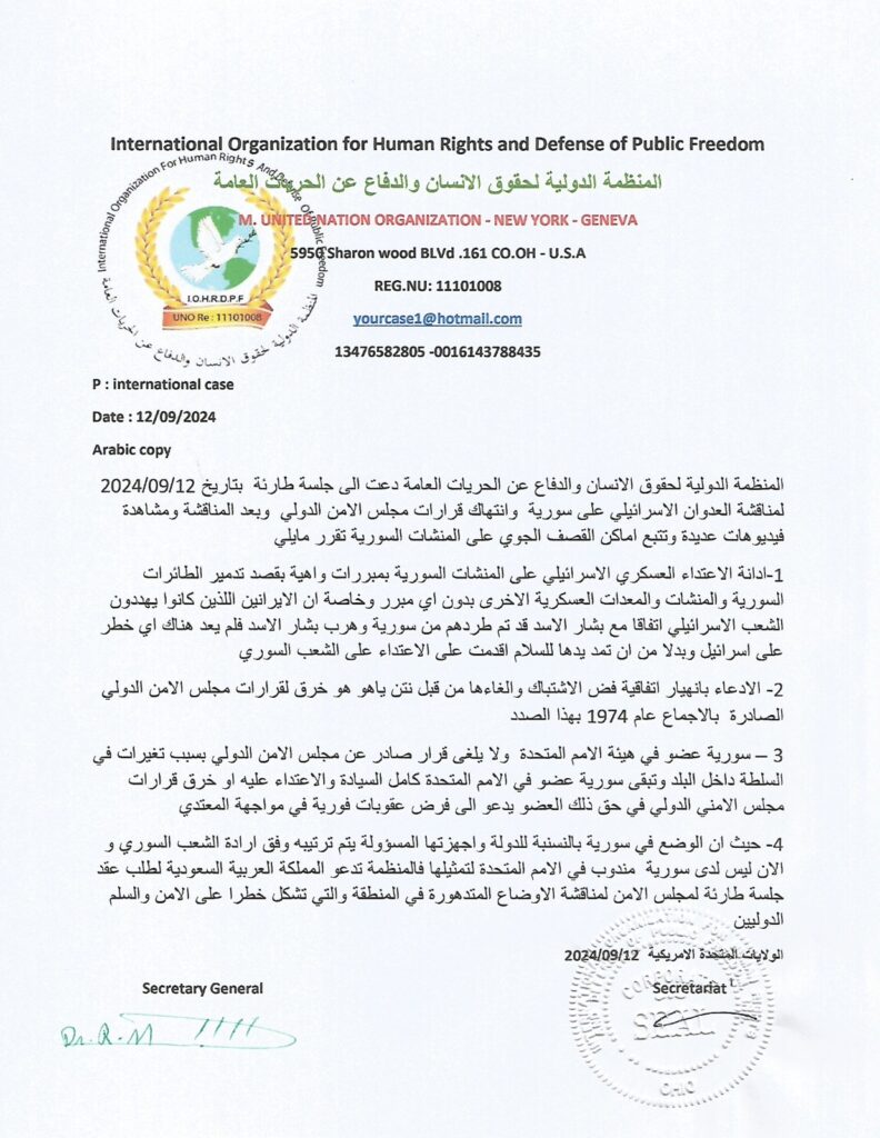 المنظمة الدولية لحقوق الانسان والدفاع عن الحريات العامة تدعو إلى جلسة طارئة لمناقشة العدوان الاسرائيلي على سورية
