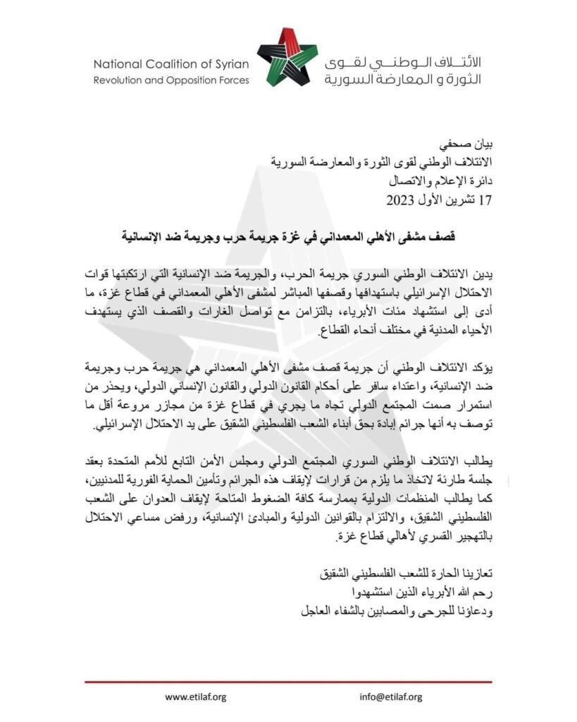يؤكد الائتلاف الوطني أن جريمة قصف مشفى الأهلي المعمداني هي جريمة حرب وجريمة ضد الإنسانية، واعتداء سافر على أحكام القانون الدولي والقانون الإنساني الدولي، ويحذر من استمرار صمت المجتمع الدولي تجاه ما يجري في قطاع غزة من مجازر مروعة أقل ما توصف به أنها جرائم إبادة بحق أبناء الشعب الفلسطيني الشقيق على يد الاحتلال الإسرائيلي.