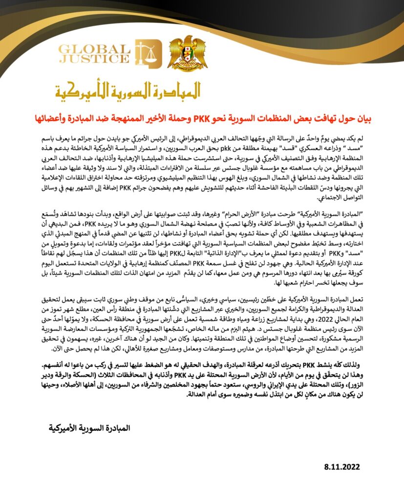 لم يكد يمضي يومٌ واحدٌ على الرسالة التي وجّهها التحالف العربي الديموقراطي، إلى الرئيس الأميركي جو بايدن حول جرائم ما يعرف باسم ”مسد“ وذراعه العسكري “قسد” بهيمنة مطلقة من PPK بحق العرب السوريين، واستمرار السياسة الأميركية الخاطئة بدعم هذه المنظمة الإرهابية وفق التصنيف الأميركي في سورية، حتى استشرست حملة هذه الميليشيا الإرهابية وأذنابها، ضد التحالف العربي الديموقراطي من باب مساهمته مع مؤسسة غلوبال جستس عبر سلسلة من الافتراءات المبتذلة، التي لا سند ولا وثيقة عليها ضد أعضاء تلك المنظمة وضد نشاطها في الشمال السوري، وبلغ الهوس بهذا التنظيم الميليشياوي ومرتزقته حد محاولة اختراق اللقاءات الإعلامية التي يجرونها ودسّ اللقطات البذيئة الفاحشة أثناء حديثهم للتشويش عليهم وهم يفضحون جرائم PKK إضافة إلى التشهير بهم في وسائل التواصل الاجتماعي.
