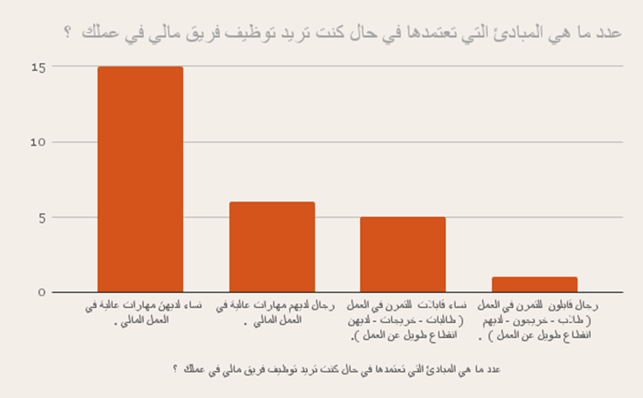 فإن 15 صوتاً يرجح بأنه يريد نساء لديهن مهارات عالية في العمل المالي، بينما 6 أصوات فقط فضلت أن يكون هناك رجال لديهم مهارات عالية في العمل المدني، و5 أصوات أرادت توظيف نساء قابلات للتمرن وأقل من 5 أصوات رجحت رجالاً قابلون للتمرن.