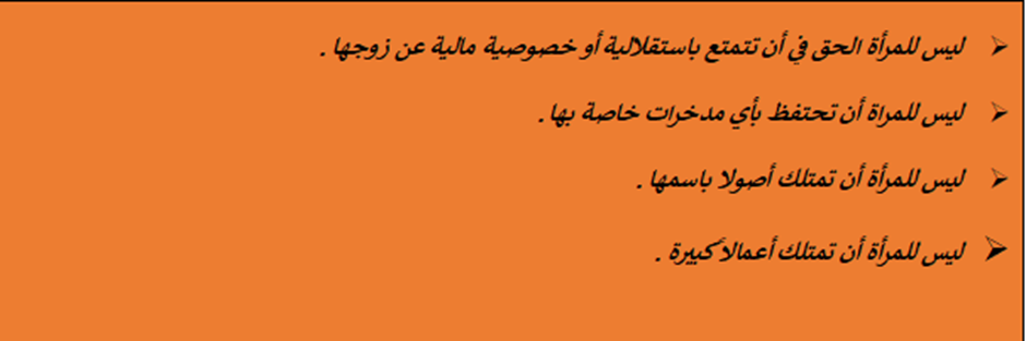وتعلل هذه النتائج بأنه ينظر للمرأة بعين الشك والريبة في إمكانية هجر زوجها أو أنها تريد منفعة لأسرتها (الأم – الأب – الإخوة أو الأخوات) بمعزل عن زوجها.