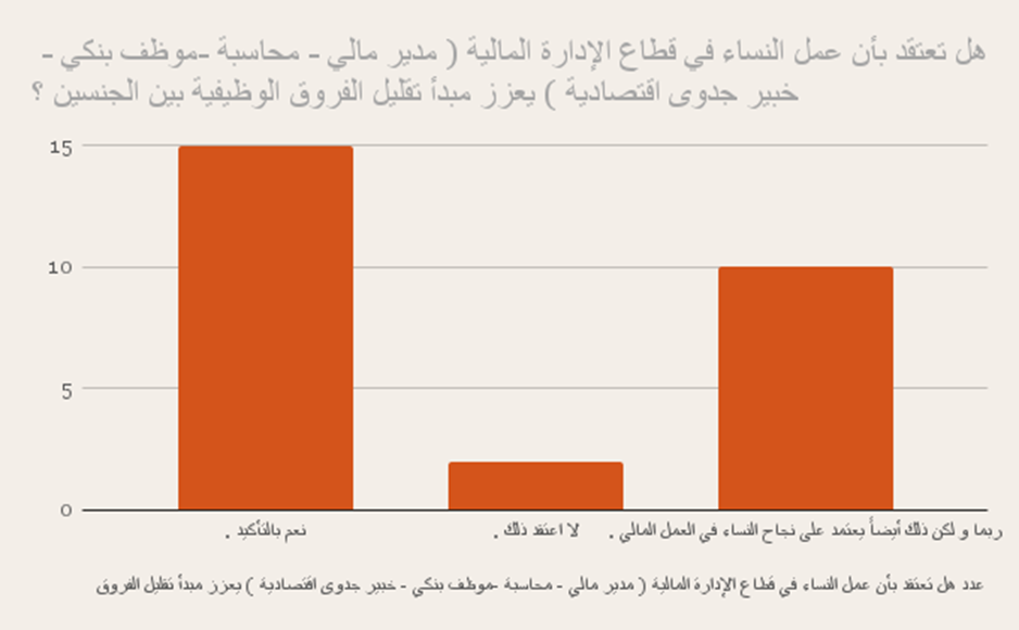 وندرج نتيجة سؤال آخر من أسئلة الاستطلاع “هل تعتقد بأن عمل النساء في قطاع الإدارة المالية (مدير مالي – محاسبة – موظف بنكي – خبير جدوى اقتصادية) يعزز مبدأ تقليل الفروق الوظيفية بين الجنسين؟”