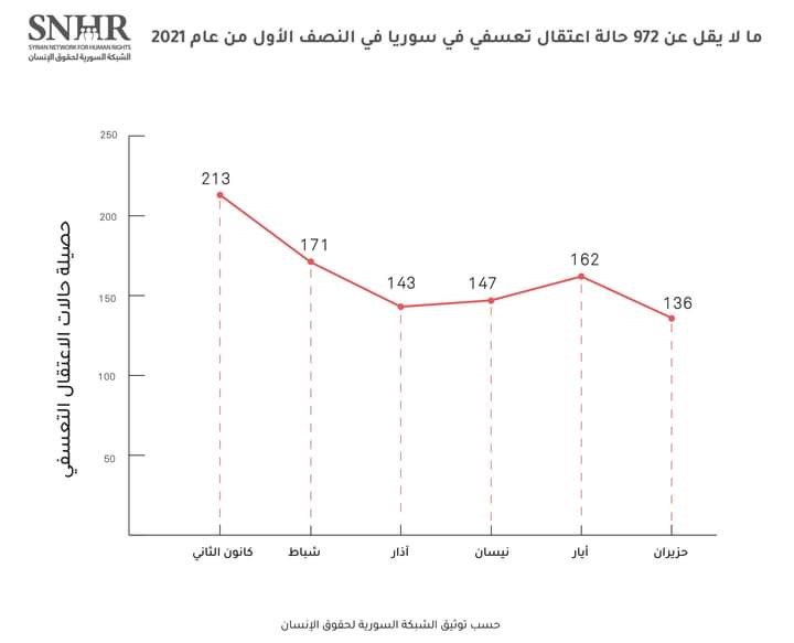 أصدرت الشبكة السورية لحقوق الإنسان يوم الجمعة 2 تموز2021، تقرير خاص استعرضت فيه حصيلة عمليات الاعتقال التَّعسفي التي سجلتها في حزيران والنصف الأول من عام 2021 على يد أطراف النِّزاع والقوى المسيطرة في سوريا، وقالت “إنَّ ما لا يقل عن 972 حالة اعتقال تعسفي قد تم توثيقها في النصف الأول من عام 2021 بينهم 45 طفلاً و42 سيدة”، مشيرةً إلى أن الاعتقال التعسفي مستمر في سورية، ويكمم الأفواه ويستهدف المجتمع بشكل كامل.