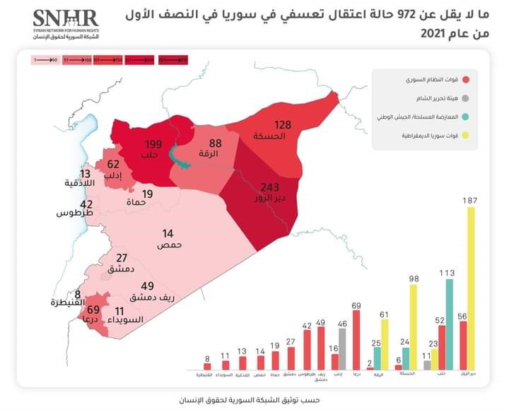 كما استعرض التَّقرير توزُّع حالات الاعتقال التعسفي في النصف الأول من عام 2021 بحسب المحافظات السورية، حيث كان أكثرها في محافظة دير الزور243 معتقل، ثم حلب 199 معتقل، تليها الحسكة 128 معتقل، ثم الرقة 88 معتقل، فدرعا69 معتقل.