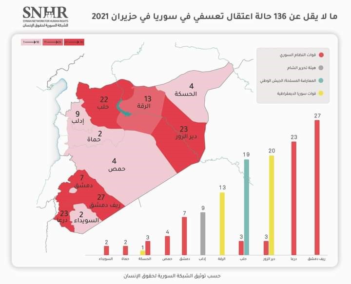 كما استعرض التَّقرير توزُّع حالات الاعتقال التعسفي في حزيران 2021 بحسب المحافظات، حيث كان أكثرها في محافظة ريف دمشق 27 معتقل، تليها درعا 23 معتقل، ودير الزور 23 معتقل، ثم حلب22 معتقل، ثم الرقة 13 معتقل.