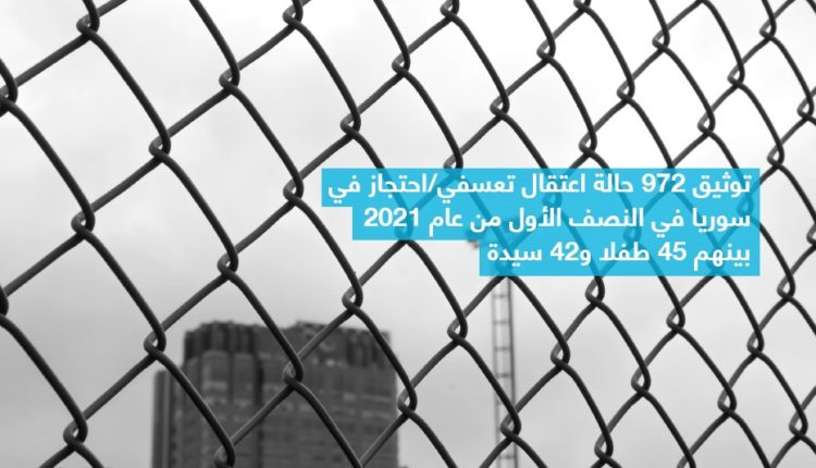 وثَّق التقرير في النصف الأول من عام 2021 ما لا يقل عن 972 حالة اعتقال تعسفي بينها 45 طفلاً و42 سيدة، وقد تحول 755 منهم إلى مختفين قسرياً.