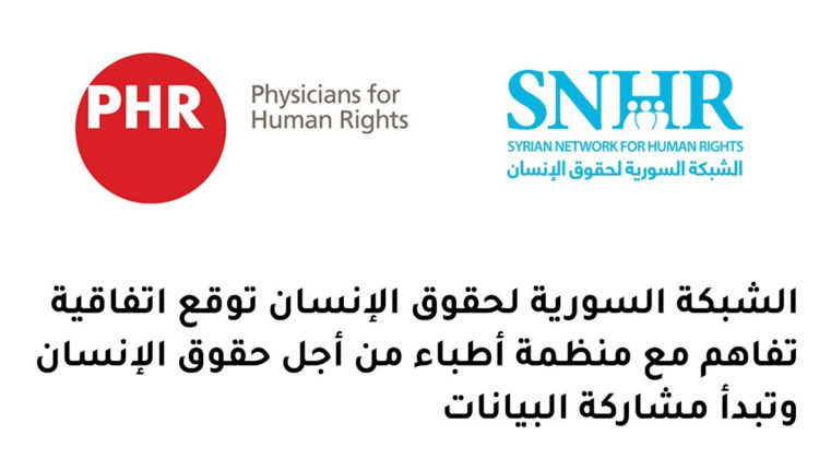 أصدرت الشبكة السورية لحقوق الإنسان يوم الاثنين 16 آب 2021، بيان صحفي تحدثت فيه عن توقَّيعها مذكرة تفاهم مع منظمة أطباء من أجل حقوق الإنسان (PHR) تنصُّ الاتفاقية على بناء آلية تنسيق وتعاون؛ من أجل مشاركة معلومات وبيانات وثَّقتها الشبكة السورية لحقوق الإنسان بحق معتقلين من الكوادر الطبية.