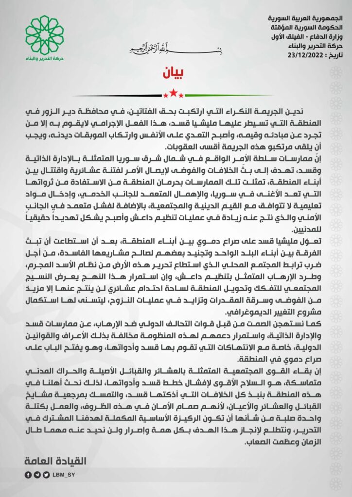 نشرت حركة التحرير والبناء المنتمية للفيلق الأول في الجيش الوطني السوري بياناً أدانت فيه الجريمة البشعة التي ارتكبت بحق فتاتين في محافظة دير الزور، هذه الجريمة وقعت في المنطقة التي تسيطر عليها ما تسمى (قوات سوريا الديمقراطية).