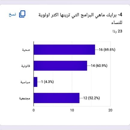 وفي استطلاع رأي قمت به، بيّن لنا أعداد السيدات اللواتي استفدن من برامج المنظمات أو يرغبن في الاستفادة منها، كما تم توضيح البرامج التي تمت الاستفادة منها في هذا المجال: