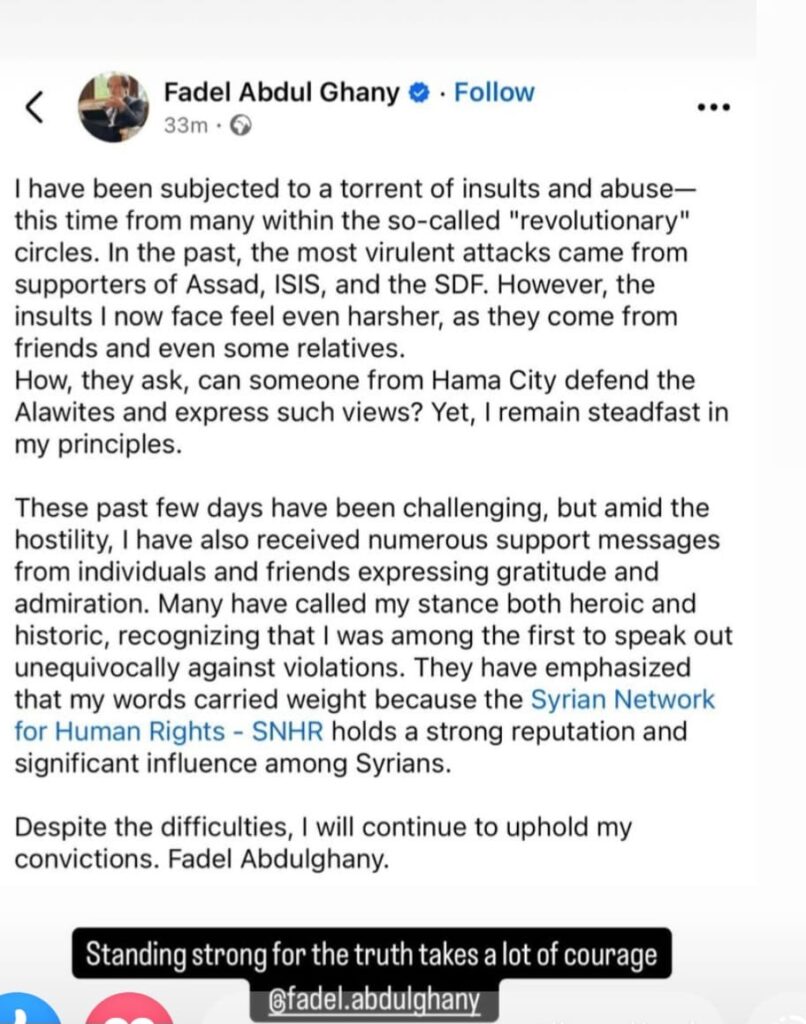 “لقد تعرضت لوابل من الإهانات والإساءات—وهذه المرة من العديد داخل ما يسمى بـ “الدوائر الثورية”. في الماضي، جاءت أشد الهجمات من مؤيدي الأسد، وداعش، وقوات سوريا الديمقراطية. لكن الإهانات التي أواجهها الآن تبدو أكثر قسوة، لأنها تأتي من أصدقاء وحتى بعض الأقارب.”