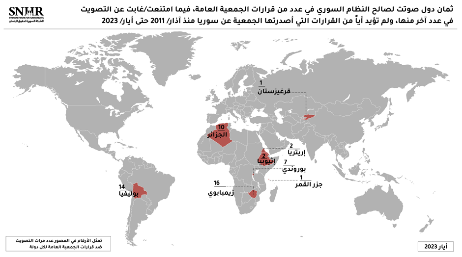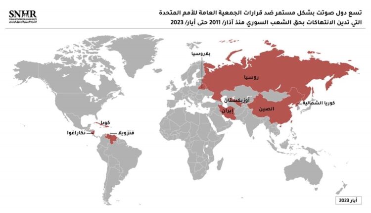 أصدرت “الشبكة السورية لحقوق الإنسان” يوم الخميس 8 حزيران 2023، تقريراً بعنوان “تسع دول فقط من أصل 193 دولة صوتت لصالح النظام السوري منذ آذار/2011 في قرارات الجمعية العامة للأمم المتحدة”، وأشارت فيه إلى أن بعض الدول العربية التي تعيد علاقاتها مع النظام السوري كانت قد صوتت ضده في جميع قرارات الجمعية العامة للأمم المتحدة.