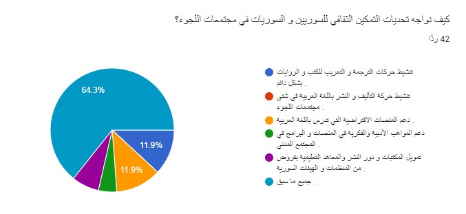 وضمن سؤال آخر طرحناه على العينة المستهدفة في الاستبيان: كيف نواجه تحديات التمكين الثقافي للسوريين والسوريات في مجتمعات اللجوء؟