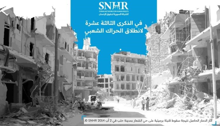 بمناسبة الذكرى السنوية الثالثة عشرة للثورة السورية، أصدرت الشبكة السورية لحقوق الإنسان تقريرها السنوي، يوم الجمعة 15 آذار عام 2024، وثقت حصيلة أبرز انتهاكات حقوق الإنسان المرتكبة في سوريا خلال ثلاثة عشر عاماً منذ آذار 2011 حتى آذار 2024، موضحةً أن الشعب السوري الذي خرج مطالباً بالانتقال السياسي الديمقراطي منذ 13 عاماً، تُرك وحيداً في مواجهة أعتى الأنظمة الديكتاتورية.