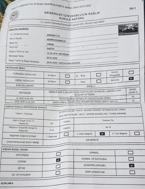 وهو أيضا ما أكده فادي الخلف، من ذوي الاحتياجات الخاصة وعمره 36 عاما بأن والدته تعاني من فشل كلوي منذ أربع سنوات وأدى الفشل الكلوي المزمن لديها الى إصابتها بفقدان البصر وأصبحت حاليا مقعدة على كرسي متحرك وأن التقرير الطبي والذي يطلق عليه الرابور نسبته عالية جدا فوق 90% ولكن وجود كلمة هير أي أنها قادرة على العمل حرمتها من الحصول على مساعدات الهلال الاحمر التي تعطى لمن لديهم تقارير طبية بنسب عالية