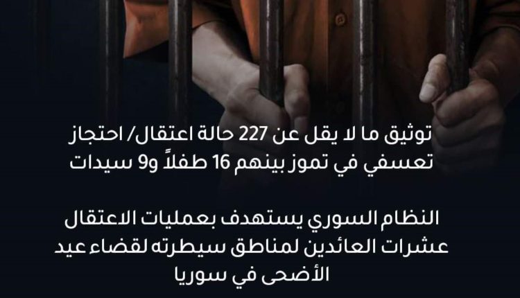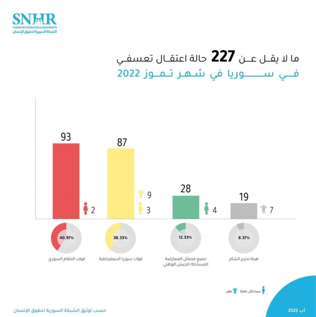وثقت “الشبكة السورية لحقوق الإنسان” 227 حالة اعتقال تعسفي بينهم 16 طفلاً و9 نساء خلال تموز الماضي، وأضافت أن 187من حالات الاعتقال التعسفي المذكورة تحولت إلى حالات اختفاء قسري، مشيرةً إلى أنَّ النظام السوري استهدف بعمليات الاعتقال عشرات العائدين لمناطق سيطرته لقضاء عيد الأضحى.